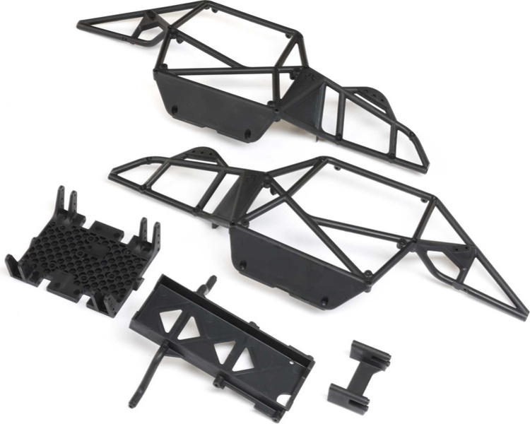 Náhradný diel pre RC model auta Axial Gilamon AXP8: bočnica klietky, klzné lyžiny, deka batérií.