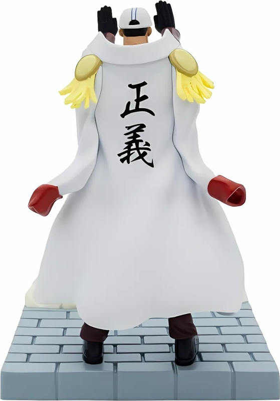 La figura captura al almirante Akainu en estado de combate, con énfasis en cada detalle – desde su icónica uniforme rojo y negro hasta su expresión facial intensa y cabello que recuerda a lava fluyendo.