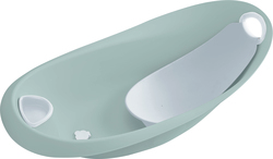 Bonita bañera está equipada con varios detalles, un mango suave, un tapón para drenar el agua, una forma inconfundible y un práctico asiento / tumbona para bebés que se sujeta en el interior de la bañera.