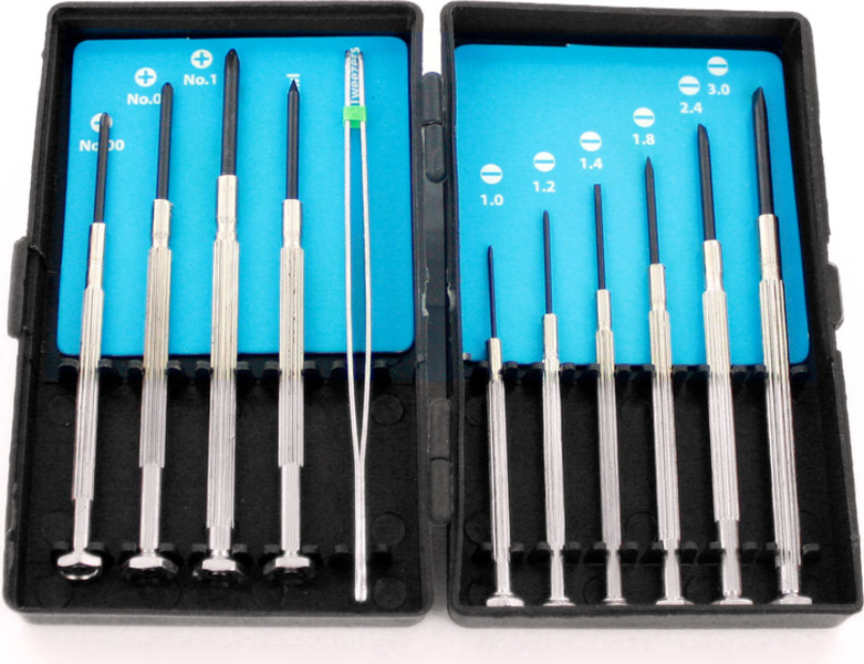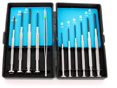 Los destornilladores de relojero Modelcraft (juego de 10 piezas) son útiles para pequeños elementos de fijación. Destornilladores planos de 1.0, 1.2, 1.4, 1.8, 2.4, 3.0 mm, Phillips cruzados 00, 0, 1, punta y pinzas, todo en un estuche de plástico. Longitud del mango de 50 a 70 mm, diámetro de 3 a 4 mm, longitud del vástago de 20 a 26 mm.