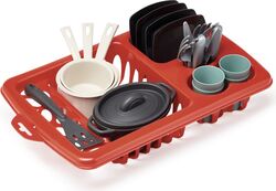 Gran juego de utensilios con escurridor incluye tazas, cubiertos, platos, olla con tapa, juego de cacerolas y espátula.