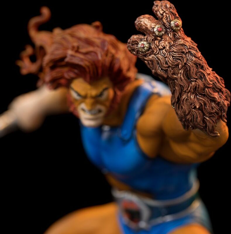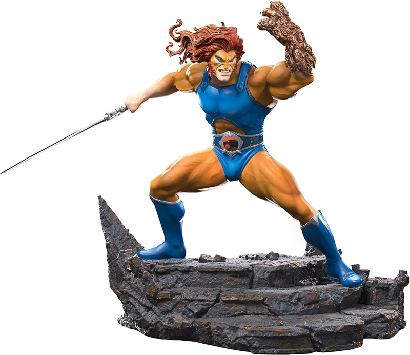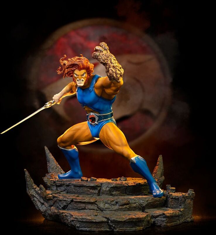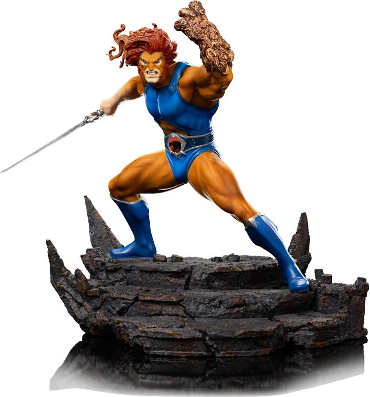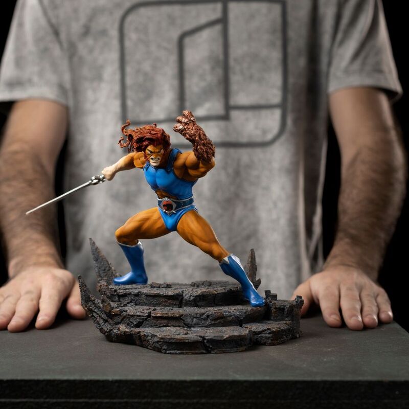 Figura Lion-O Battle Ver. – Thundercats – BDS Art Scale 1/10 de Iron Studios captura al monarca de la raza Thundera en una dinámica pose de combate. En su mano derecha sostiene la poderosa Espada de Omens (Sword of Omens) – una arma única con la mística piedra Ojo de Thundera (Eye of Thundera) incrustada en la empuñadura, capaz de convocar aliados, proporcionar a su portador el llamado “Vista más allá del horizonte" (Sight Beyond Sight) y disparar potentes ráfagas de energía. Con su mano izquierda se defiende usando el Escudo de Garras (Claw Shield) – un guante que sirve tanto como escudo como arma con funciones como disparo de gancho o cortina de humo. La figura se encuentra sobre una base de oscuras escaleras rocosas que evocan el interior de la siniestra Pirámide Negra del hechicero Mumm-Ra.