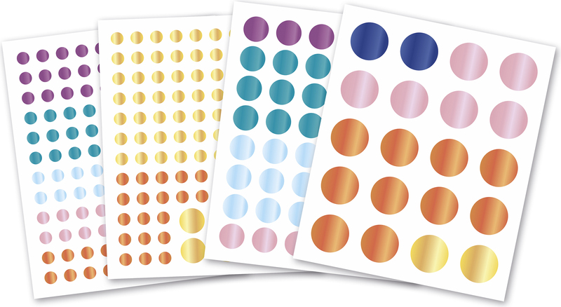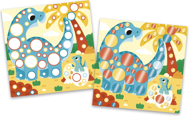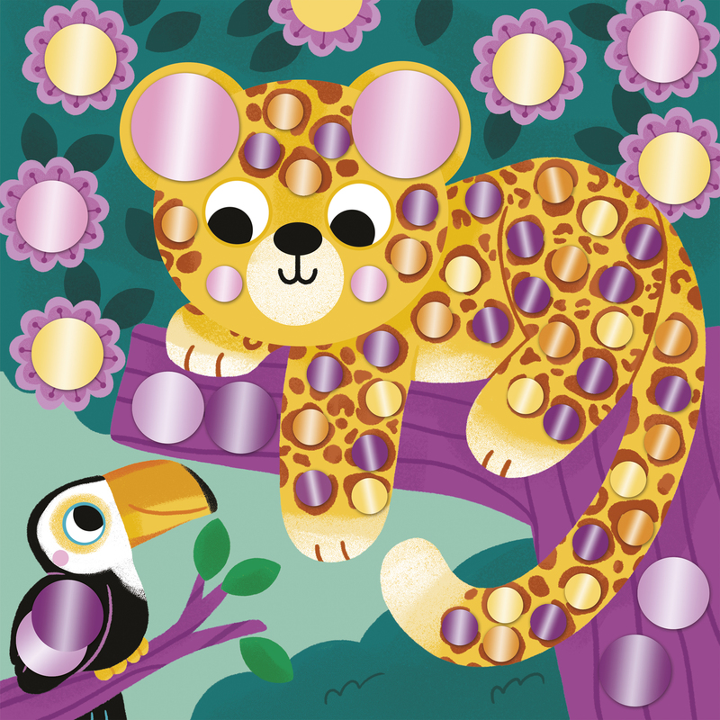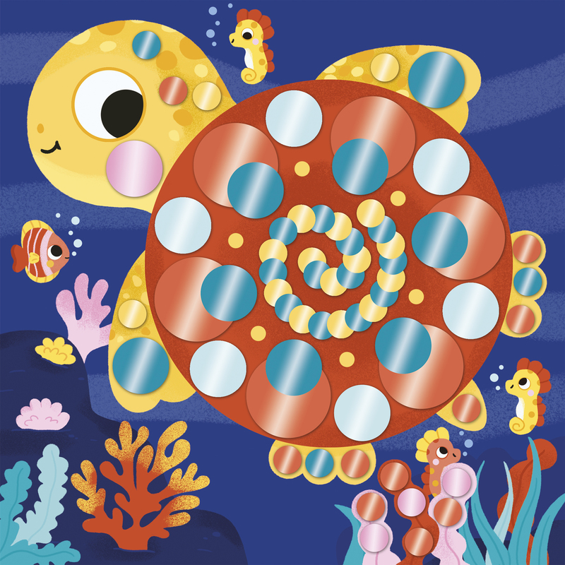Este conjunto de creación incluye la decoración de imágenes de animales con pegatinas metálicas en forma de puntos.Contiene 4 bases de 20 x 20 cm (pavo real, dinosaurio, leopardo y tortuga marina), 4 hojas de pegatinas metálicas en forma de puntos en 3 tamaños diferentes (30, 20 y 10 mm) y un folleto con instrucciones y patrones. Esta actividad ayuda a desarrollar la motricidad fina y la paciencia.