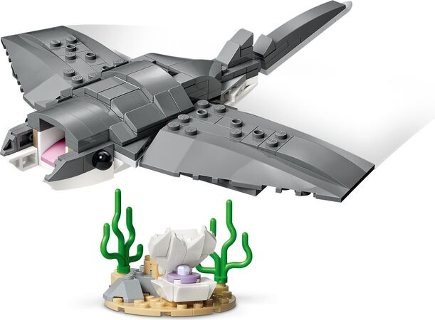 Los niños y niñas a partir de 8 años pueden jugar a divertidas historias bajo el mar con el set LEGO® Creator 3 en 1 Tiburón Salvaje y Cofre del Tesoro (31381). Este impresionante set con juguetes marinos ofrece hasta 3 opciones de construcción diferentes a partir de un solo paquete de bloques. Los niños pueden construir un tiburón de juguete articulado que se puede exhibir en una base con un cofre del tesoro y un cangrejo. Luego, pueden reconstruirlo en un pez diablo en una base con algas marinas o en una manta raya en una base con una concha. Cuando terminen de construir y se diviertan a su antojo, cada modelo se puede exhibir como decoración en una estantería o mesa.