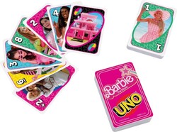 Los pequeños y grandes fanáticos de Barbie® adorarán el juego de cartas UNO® Barbie™ The Movie. Con un mazo con gráficos inspirados en los personajes y escenas favoritas, los jugadores siempre intentan hacer coincidir colores y números, y también hay una regla especial "Jugado con demasiados", que obliga al jugador a descartar y robar cartas. Cuando te quede una sola carta, ¡no olvides gritar: "UNO!". Un gran regalo para los fanáticos de Barbie® y los amantes de los juegos de cartas a partir de 7 años.