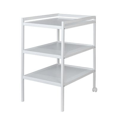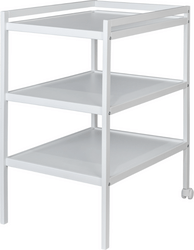 La superficie superior del cambiador, con dimensiones de 50 × 70 cm, proporciona suficiente espacio para un cambio cómodo y seguro. Los bordes elevados contribuyen a una mayor seguridad al manipular al bebé. El cambiador está equipado con dos estantes prácticos que ofrecen suficiente espacio de almacenamiento para pañales, cosméticos, ropa u otros accesorios necesarios. Gracias a esto, tiene todo lo importante siempre a mano. Para mayor comodidad en su uso, el cambiador cuenta con ruedas en dos patas que permiten moverlo fácilmente según sea necesario.