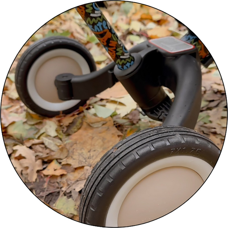 El manillar con empuñaduras de goma antideslizantes es ajustable, los pedales son desmontables y el asiento se adapta a la altura. Los cinturones de seguridad ajustables garantizan estabilidad y seguridad incluso en paseos más rápidos. Las resistentes ruedas de goma aseguran un paseo suave en diversas superficies, ya sea en configuración de dos o tres ruedas.