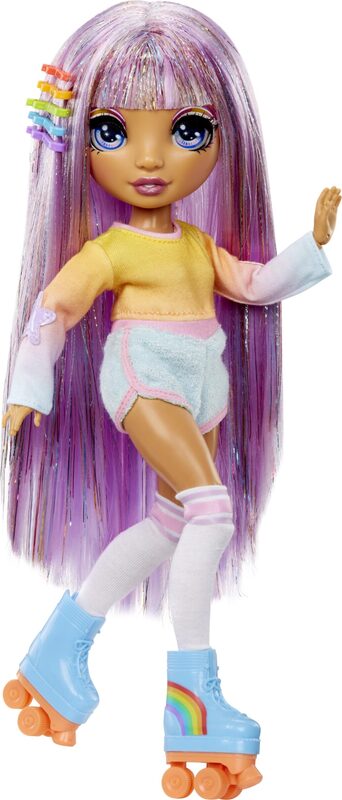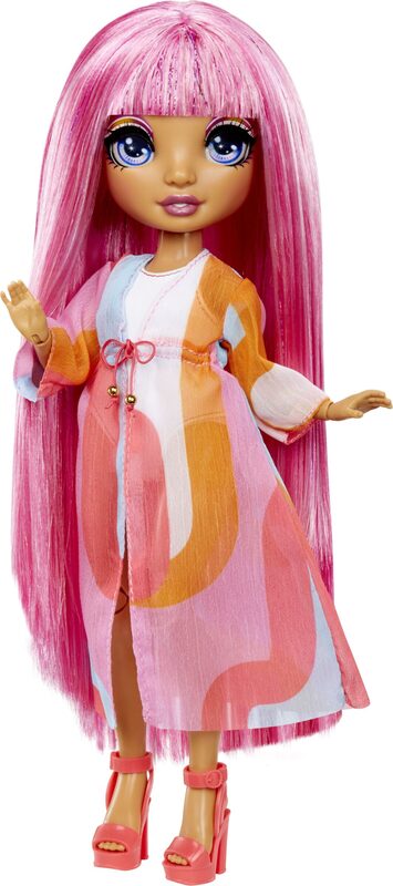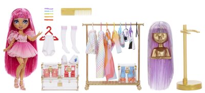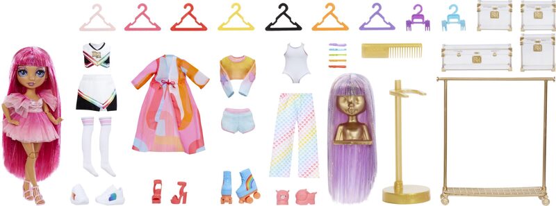 En el salón de moda encontrarás una exclusiva muñeca Fashion, de la cual puedes elegir un atuendo de arcoíris estiloso según tu propia fantasía. En el paquete encontrarás más de 10 piezas de moda y 4 pares de zapatos, con los cuales crearás más de 300 combinaciones de moda. Colgarás la ropa en una lujosa barra de armario dorada. Cambia también el peinado de la muñeca, el paquete incluye 2 pelucas.