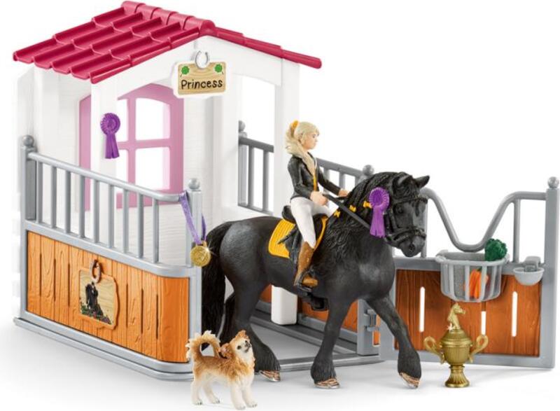 La cuadra del club con el caballo, Tori y Princess de Schleich® Horse Club ha sido decorada con todo el amor. La cinta para el ganador, la medalla de oro y el trofeo muestran los logros ecuestres conjuntos de las figuras totalmente articuladas Tori y su Princess, una hermosa yegua frisona.