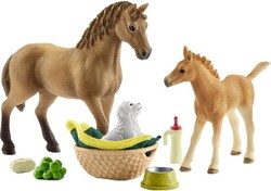 Schleich 42432 set yegua con potro y cachorro en la cesta. ¡Hay un nuevo potro en el mundo! Está siendo alimentado con biberón. La yegua deja que Sarah se acerque a él. El potro también recibe un agradable masaje con un cepillo. ¡Pero el tiempo vuela! Sarah casi olvida al cachorro de unos días... Él ya espera impacientemente en su cesta.