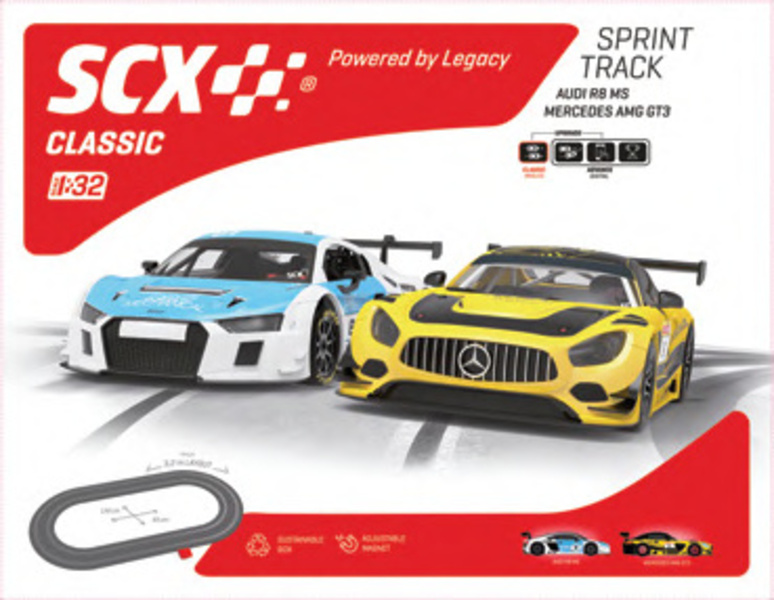 Autodráha pre deti SCX Sprint Track v klasickej mierke 1:32 pre napínavejšie preteky - analógová elektrická autodráha v tvare oválu. Dva ergonomické ovládače, dve detailne spracované dráhové autíčka Mercedes AMG GT3 a Audi R8 MS. Plocha pre rozloženie: 148 cm x 82 cm. Dĺžka trate: 3,33 m. Složenie trate je veľmi jednoduché, jednotlivé traťové diely zacvaknete do seba, pripojíte ovládače a môžete začať pretekať.