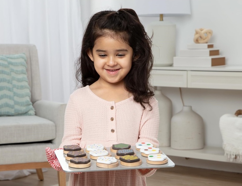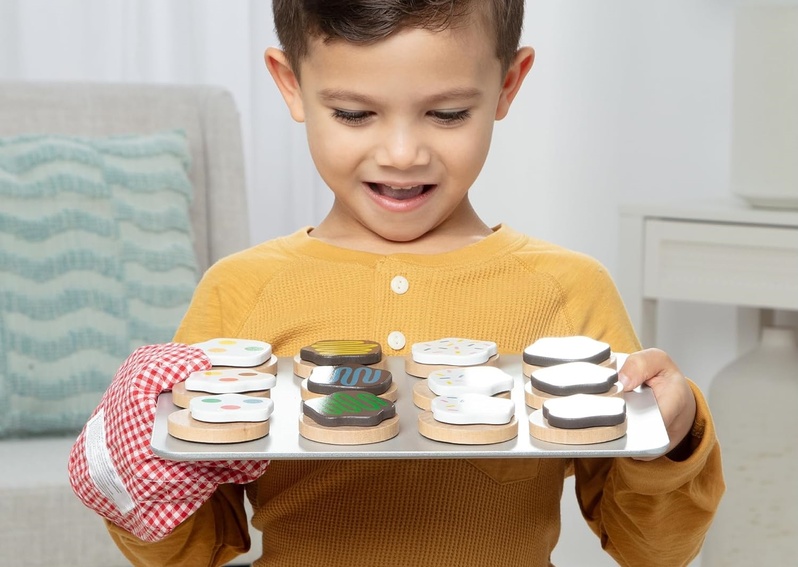 ¡Hornear es siempre una gran idea con el set de galletas de Melissa & Doug! Los niños pueden cortar la masa de galletas de madera a su gusto, colocarla en la bandeja, "hornear" y luego decorar y servir.
