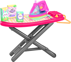 Tabla de planchar de plástico con plancha, perchero, ganchos y otros accesorios para pequeñas amas de casa. La plancha tiene efectos de sonido y luz.