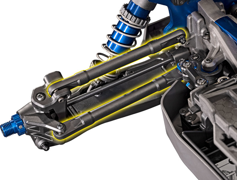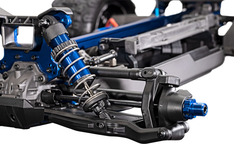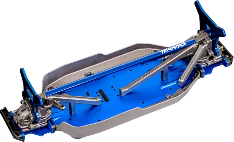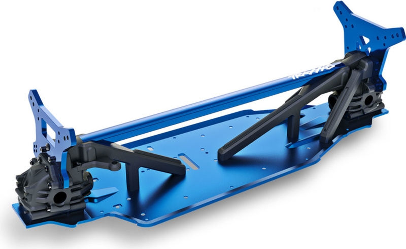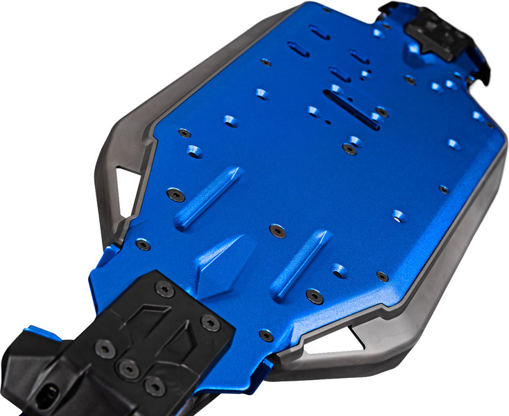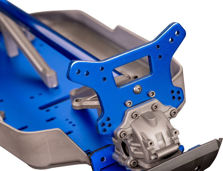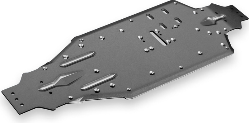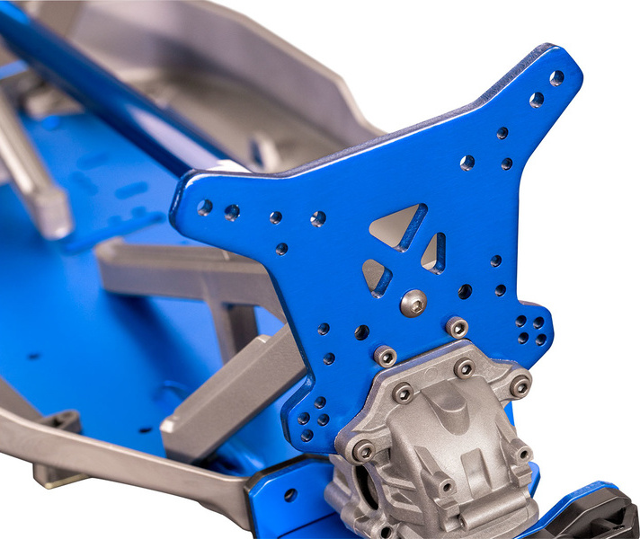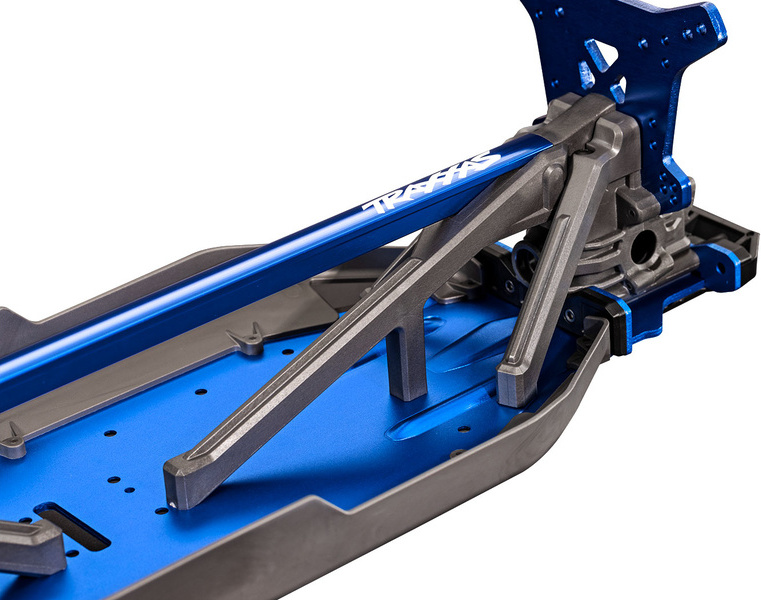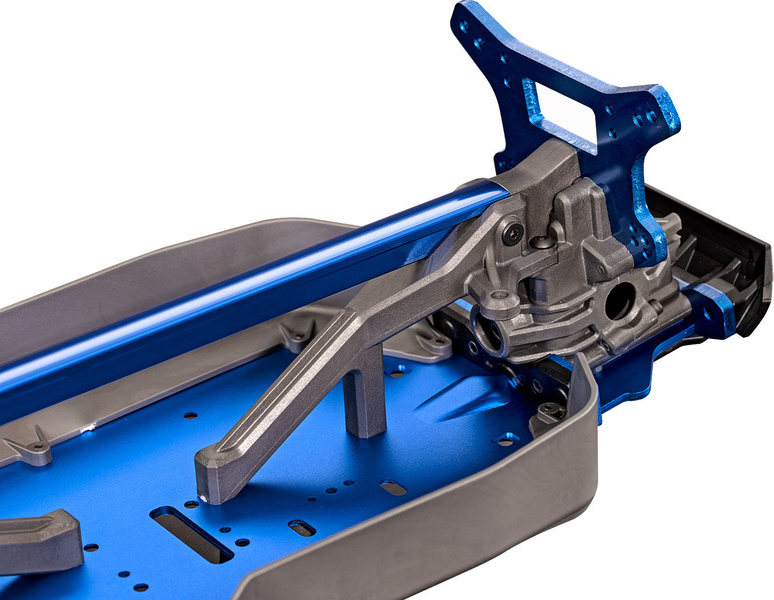 El chasis del modelo RC está formado por una placa de aluminio ligera y resistente de 3.2 mm de grosor. A lo largo de toda su longitud, los bordes están moldeados para aumentar la resistencia. Los enormes refuerzos transversales delanteros y traseros, fijados en seis puntos, proporcionan una mayor resistencia en los lugares más expuestos durante el impacto del modelo, que son los cuellos del chasis en la suspensión. Para la conexión y refuerzo total se utiliza un refuerzo central patentado en forma de T. Al igual que el chasis y el refuerzo central, las torres de los amortiguadores son de aluminio con un hermoso anodizado azul.