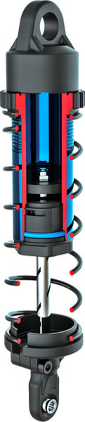 Cuatro amortiguadores GT-Maxx excepcionalmente grandes absorben eficazmente incluso los impactos más duros. El cuerpo de los amortiguadores, lleno de aceite, está equipado con una rosca y una tuerca para un fácil ajuste de la precarga de los muelles. Para evitar fugas de aceite alrededor del vástago, el amortiguador está equipado con anillos X dobles.