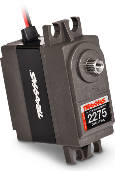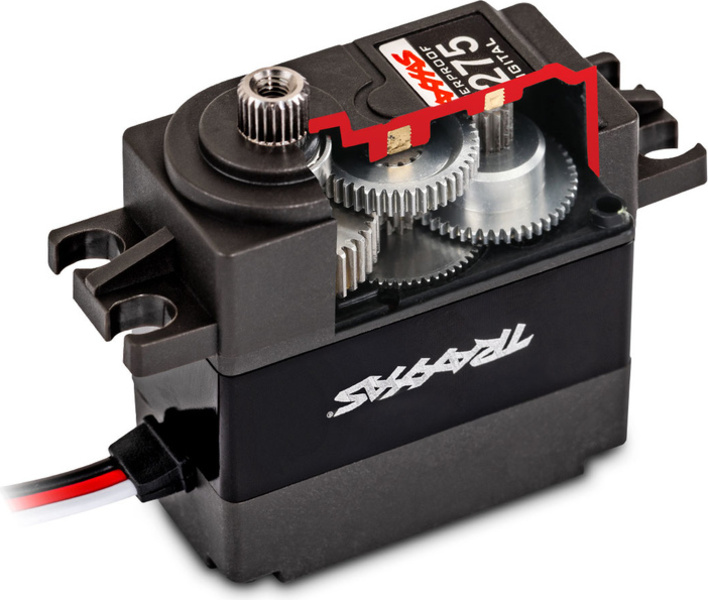 El completamente nuevo servo de dirección a prueba de agua* Traxxas 2275 tiene una increíble fuerza de 25 kg.cm. El servo está equipado con engranajes metálicos, dos rodamientos de bolas para un funcionamiento suave y una caja central de metal para una refrigeración efectiva.